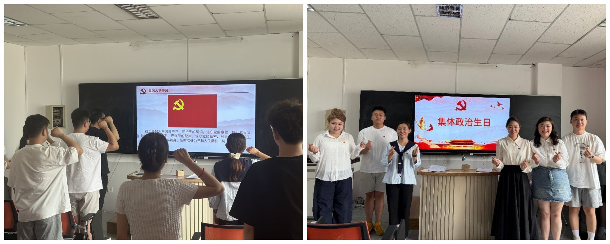 参观结束后,教师党支部全体党员在一楼大厅庄严列队,重温入党誓词,铿锵有力的誓言表达了对党的忠诚与为共产主义事业奋斗终身的决心。随后,党委书记杨志刚为7月入党的郑虎、万莹、王倩三位党员教师送上政治生日贺卡,激励大家时刻牢记党员身份,践行初心使命。三位老师也分享了自己的“党员心声”,并表示政治生日卡是党支部不断教育和引导自己强化党的意识、党员意识的重要见证。